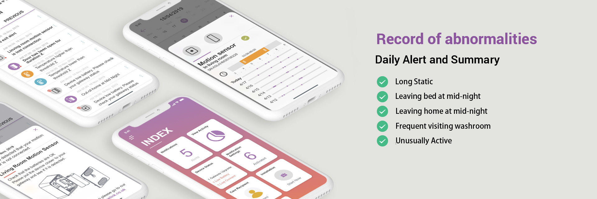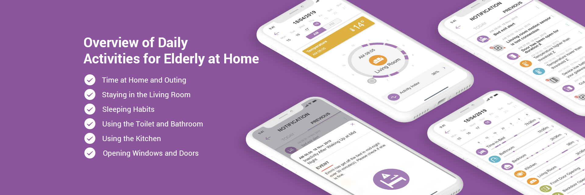 Caregivers can install sensors in the kitchen to understand the elderly's cooking habits, or in the bathroom to monitor their daily bathing time. Sensors can also be placed in the living room or bedroom, with the option to set up notifications for low indoor temperatures to identify potential health risks.