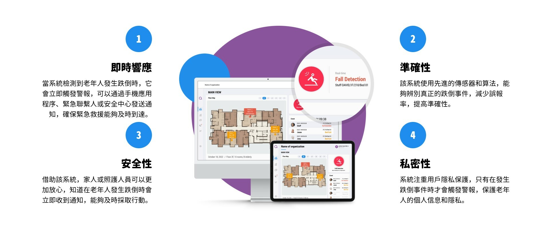 Fall detection 跌倒警報系統是一種用於監測和檢測老年人跌倒情況的技術系統。它通過使用傳感器、智能算法和通信技術,能夠及時發現老年人的跌倒事件,並發送警報通知相關人員,以便能夠及時採取救助措施。